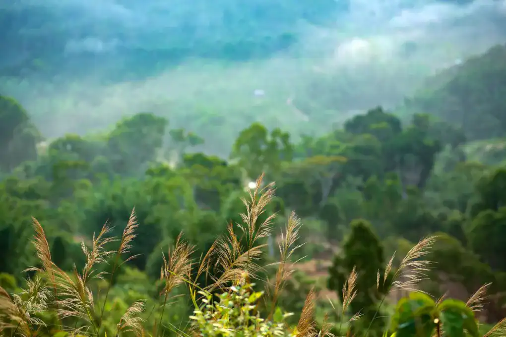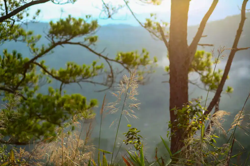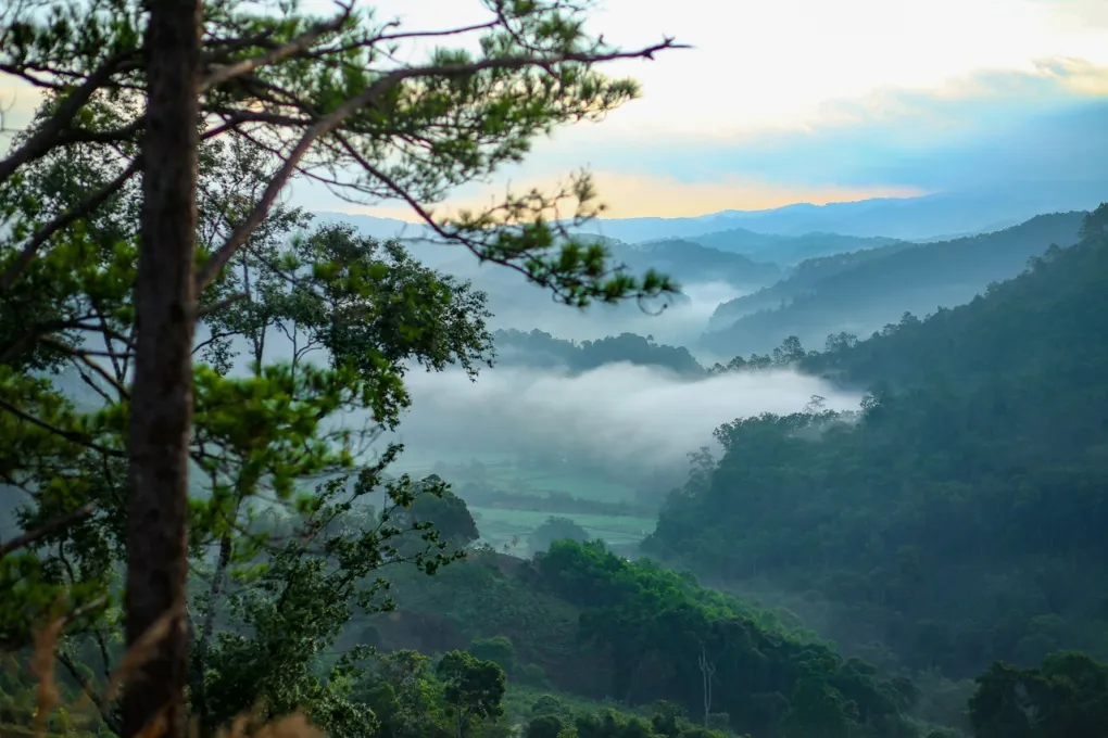 Trong 20 phút từ khi ánh sáng đầu tiên đến lúc mặt trời lên đủ cao, rừng thông Măng Đen thay đổi màu liên tục theo cách mà không màn hình nào hiển thị được đúng. Từ xanh thẫm lạnh của trước bình minh, sang xanh bạc pha trắng khi sương còn đó, rồi xanh đậm ấm khi nắng phủ, và cuối cùng — vàng. Thứ vàng nhạt rất đặc biệt của nắng sớm chạm vào đầu những cành thông cao nhất. Vàng không rực, không chói — mà là vàng ấm, như ai đó đang cầm đèn đi qua từng ngọn cây.