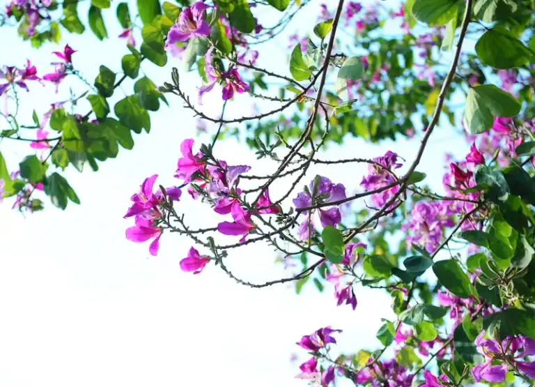 Tại Măng Đen chỉ có hoa ban tím, không có ban trắng như nhiều người nhầm lẫn với Tây Bắc. Màu tím ở đây đậm và dày hơn, cánh hoa dày, sắc trầm hơn dưới ánh nắng cao nguyên. Ban tím không mọc thành rừng lớn – chúng xuất hiện rải rác như những nốt nhấn trong bản nhạc mùa đông. Khi đứng cạnh mai anh đào hồng và mimosa vàng, sắc tím ấy làm bức tranh trở nên sâu hơn, cân bằng thị giác.